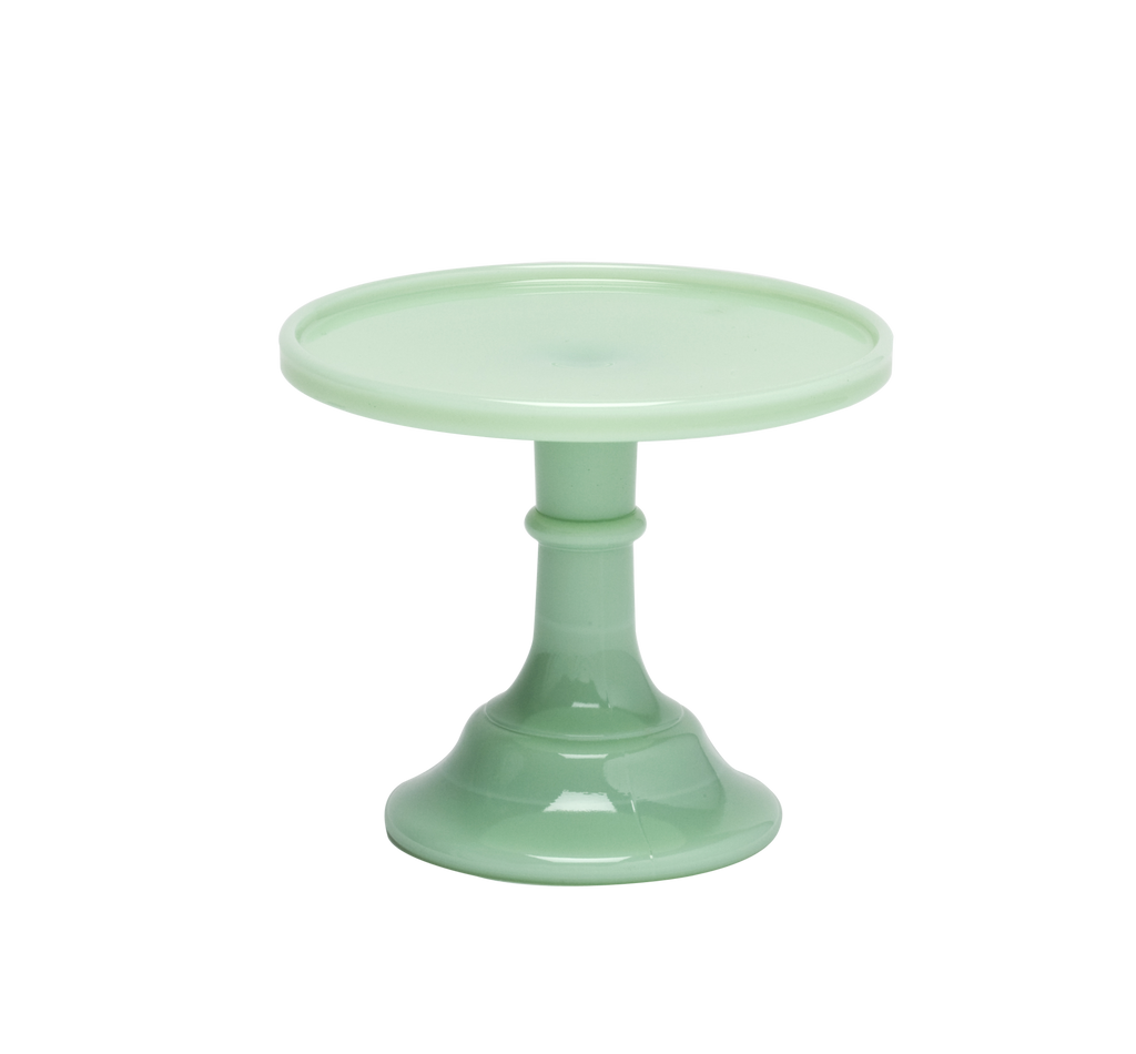 Mix in various sizes of this jadite green glass pedestal cake plate to add dimension and variety to your dessert display. Mosser Glass is made with timeless quality and hand pressed in the USA.